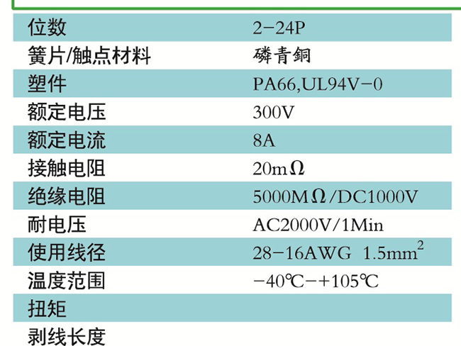 接線端子的絕緣材料用改性的尼龍(PA66),能達(dá)到或超過IEC947-7-1及EN60947-7-1標(biāo)準(zhǔn),阻燃等級(jí)達(dá)到UL94,V-0具有良好的電氣性能和機(jī)械性能。螺絲用高強(qiáng)度的鋼制成鍍鋅或鎳處理,導(dǎo)電體四方針用合金銅制成表面鍍錫,壓片采用彈性及極強(qiáng)的磷青銅表面鍍錫或鎳;壓線框用抗應(yīng)力裂縫腐蝕的合金銅制成,這些金屬表面還鍍錫或鍍鎳加以保護(hù)。設(shè)計(jì)完全符合IEC60947-7-1.GB14048.7等標(biāo)準(zhǔn)。
